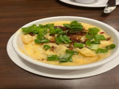 4. Stir well and serve into bowls or cups. Top with Shredded Cheese, Green Onion and more Bacon if desired before serving.
